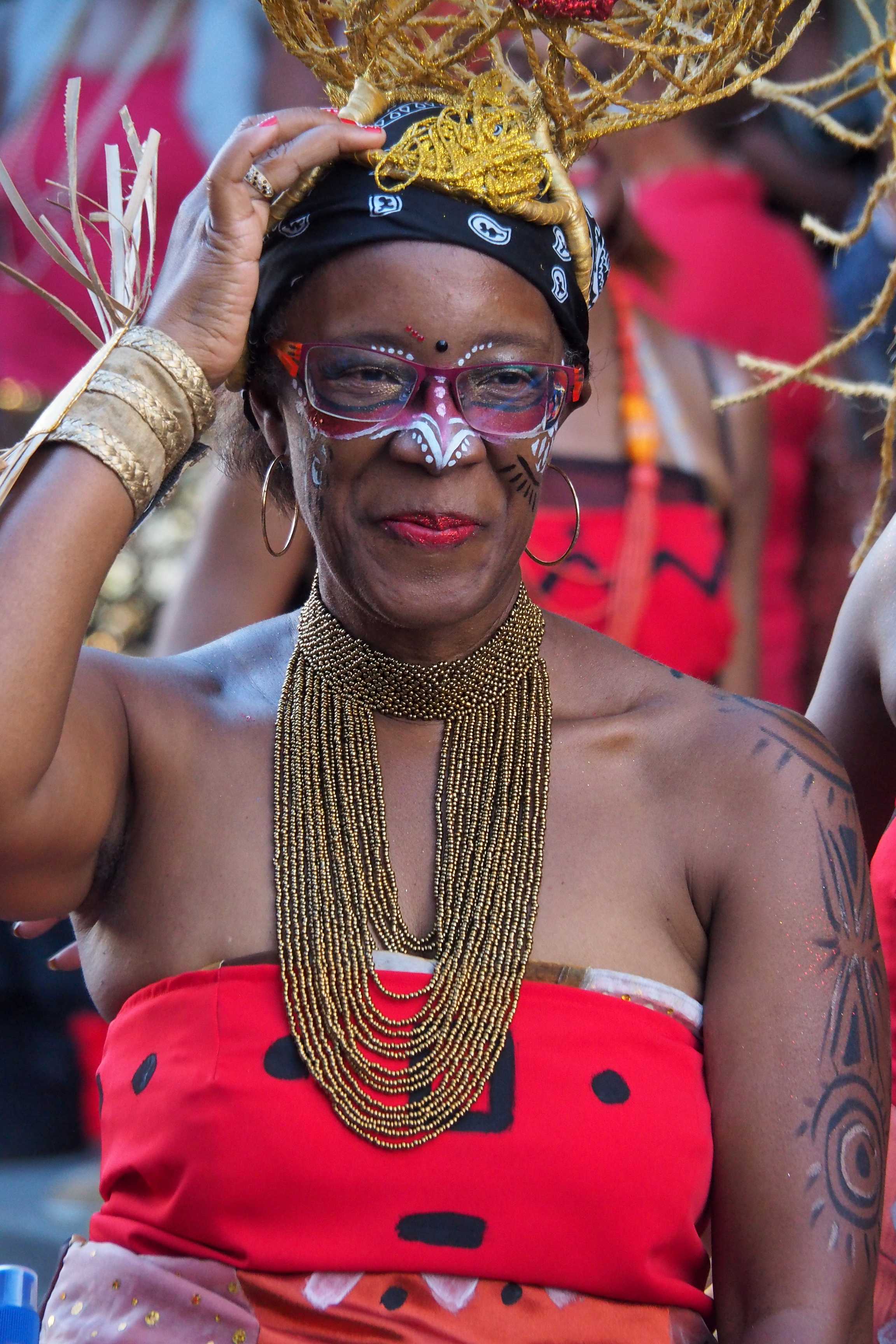 Regreso a Fort-de-France después de la visita al jardín de Balata. ¡Es martes de carnaval, día de los diablos rojos! ¡El carnaval está en su apogeo porque el día es festivo en todo el departamento! Tomamos el autobús para llegar al centro de la ciudad, cerrado a los coches. Carole aprovecha para conocer a uno de estos diablos, con vestido rojo obviamente.
