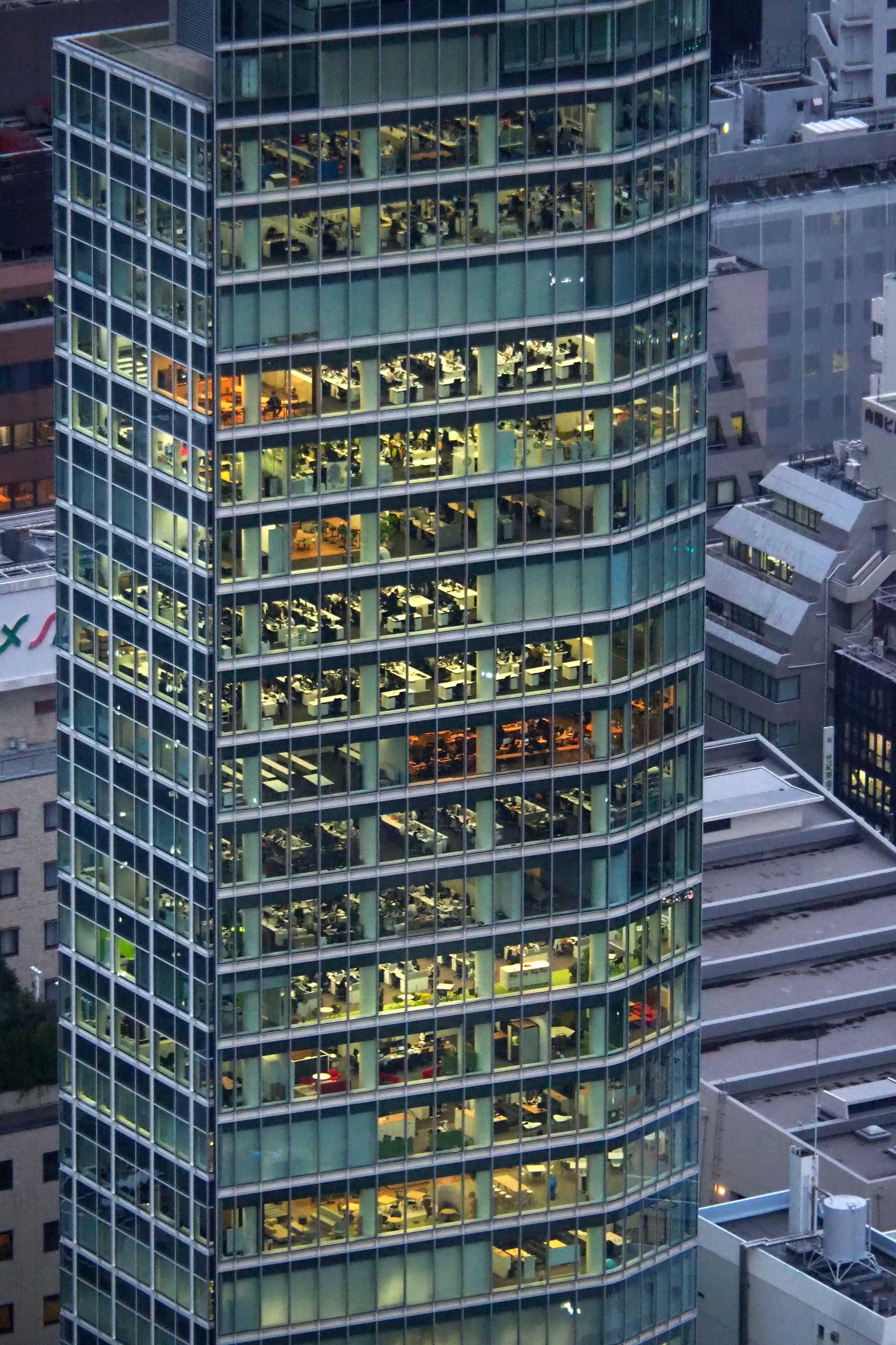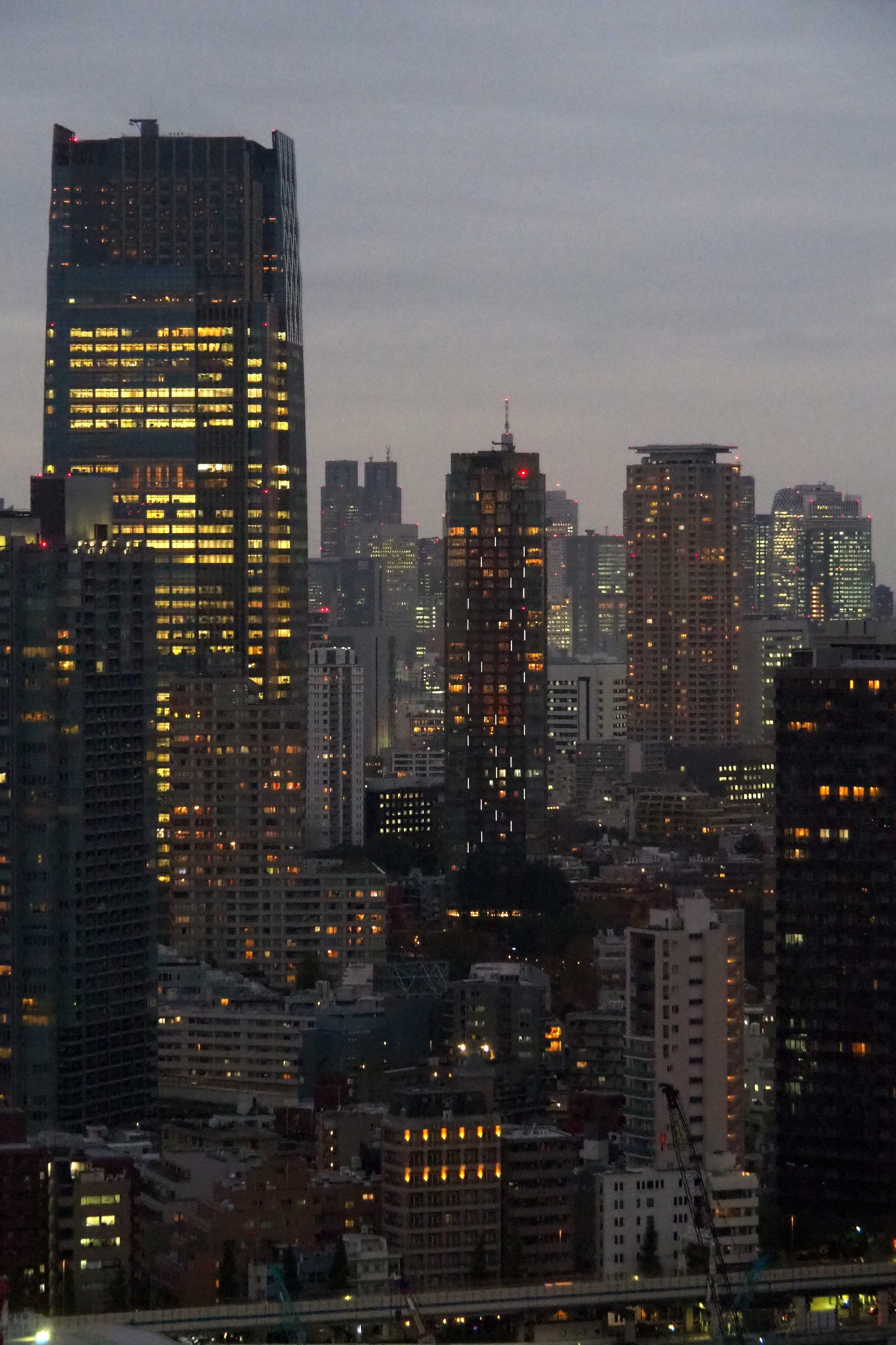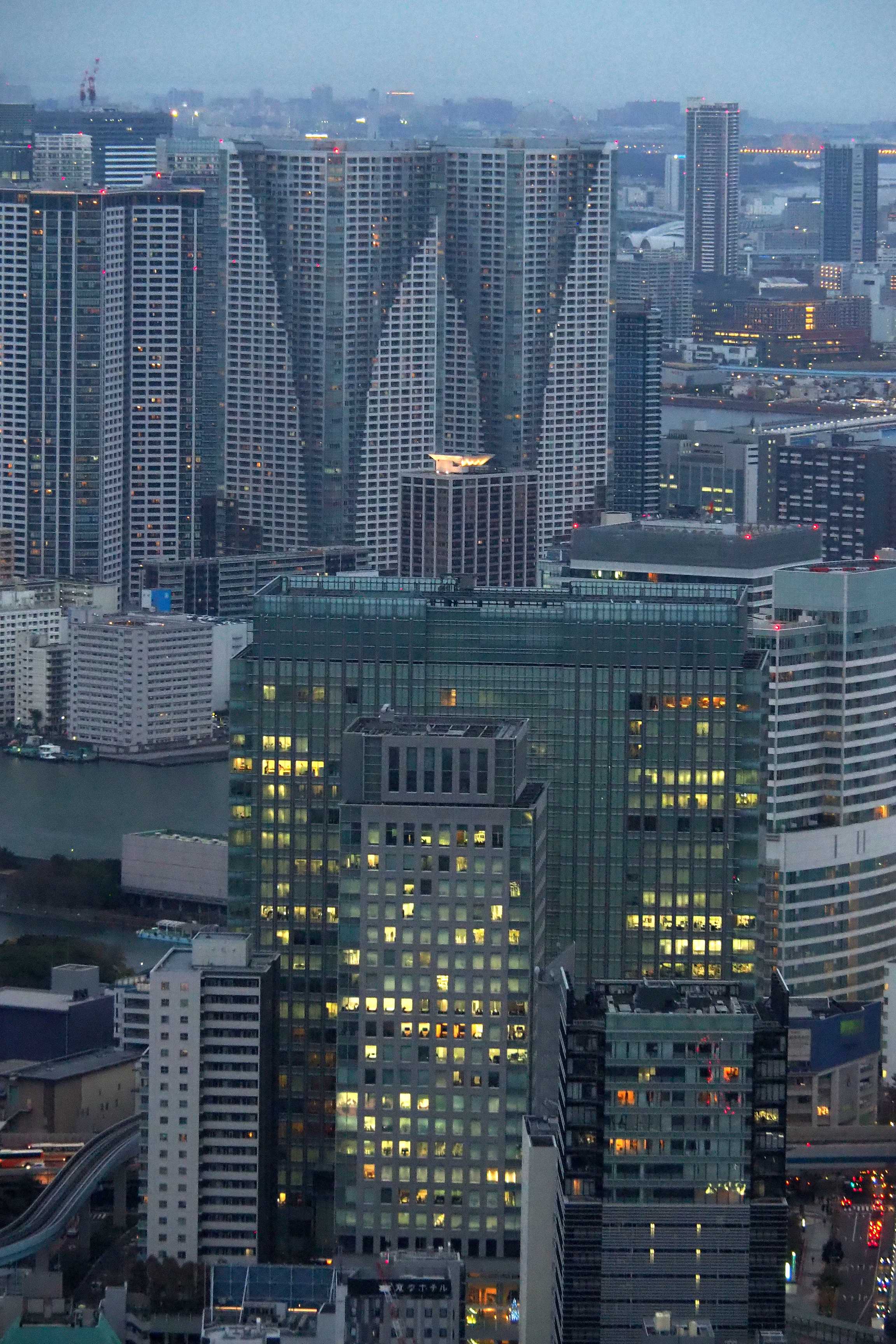 Todo el mosaico de ventanas iluminadas comienza a tomar forma a medida que las oficinas se encienden. La Skytree también pasa al modo nocturno.