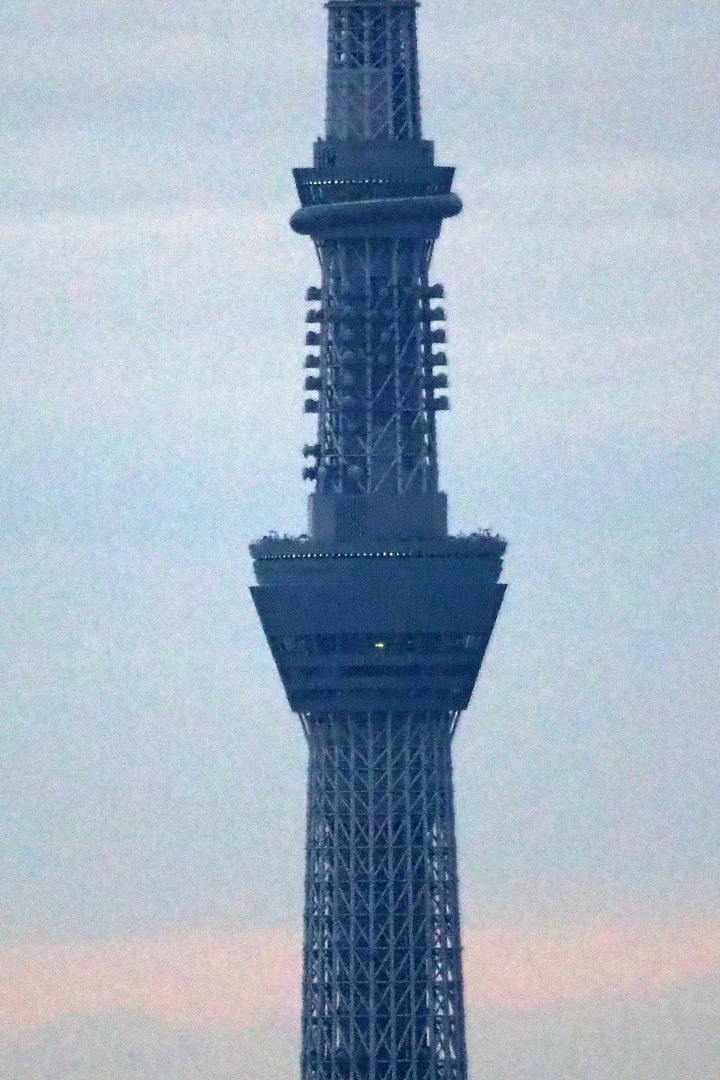 A lo lejos, se divisa la esbelta torre Skytree, ¡el doble de grande que la torre en la que estamos! Esta noche, estaremos a 8 kilómetros de aquí, en la pequeña plataforma ligeramente en espiral que se distingue bajo la fina antena.