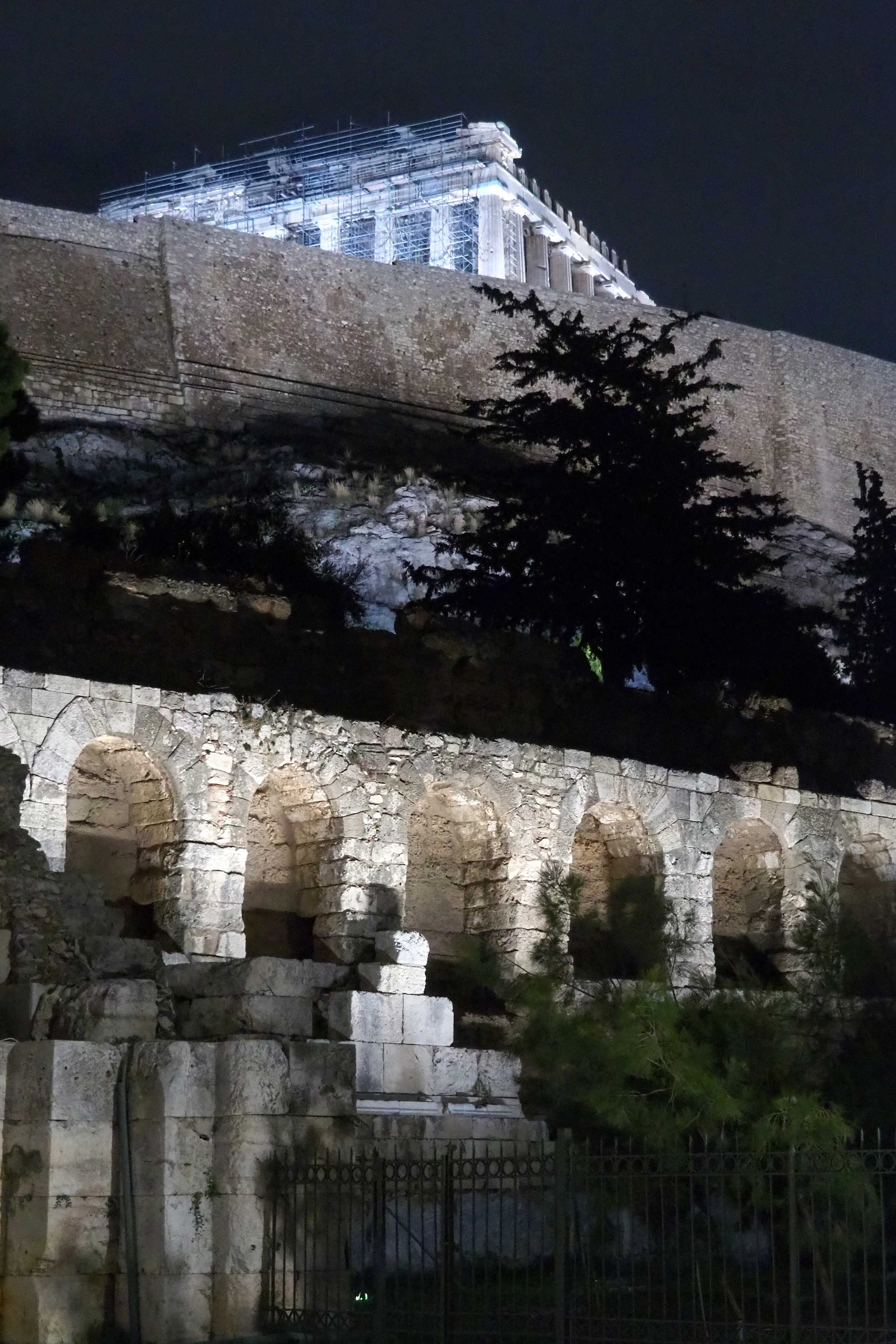 , c'est seulement sur nos pieds que nous pouons compter pour visiter la capitale sur les trois prochains jours. Heureusement, tout n'est jamais trop loin ici. Et surtout pas l'acropole, visible d'un peu partout, perchée à 156 mètres de hauteur sur sa colline. Et notre première vision du célèbre site est du plus bel effet, le joyau de la ville brille sous le feu des projecteurs...