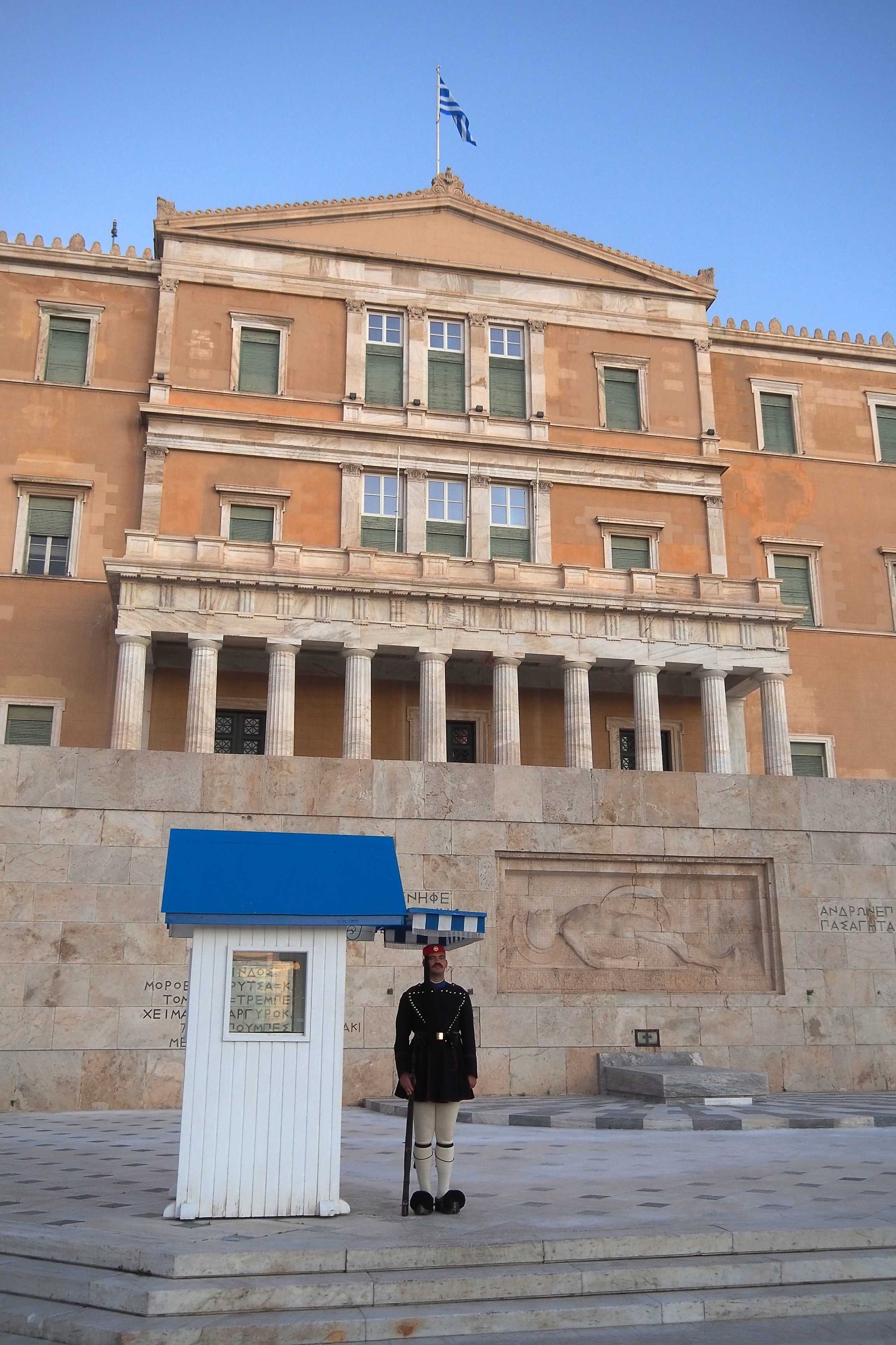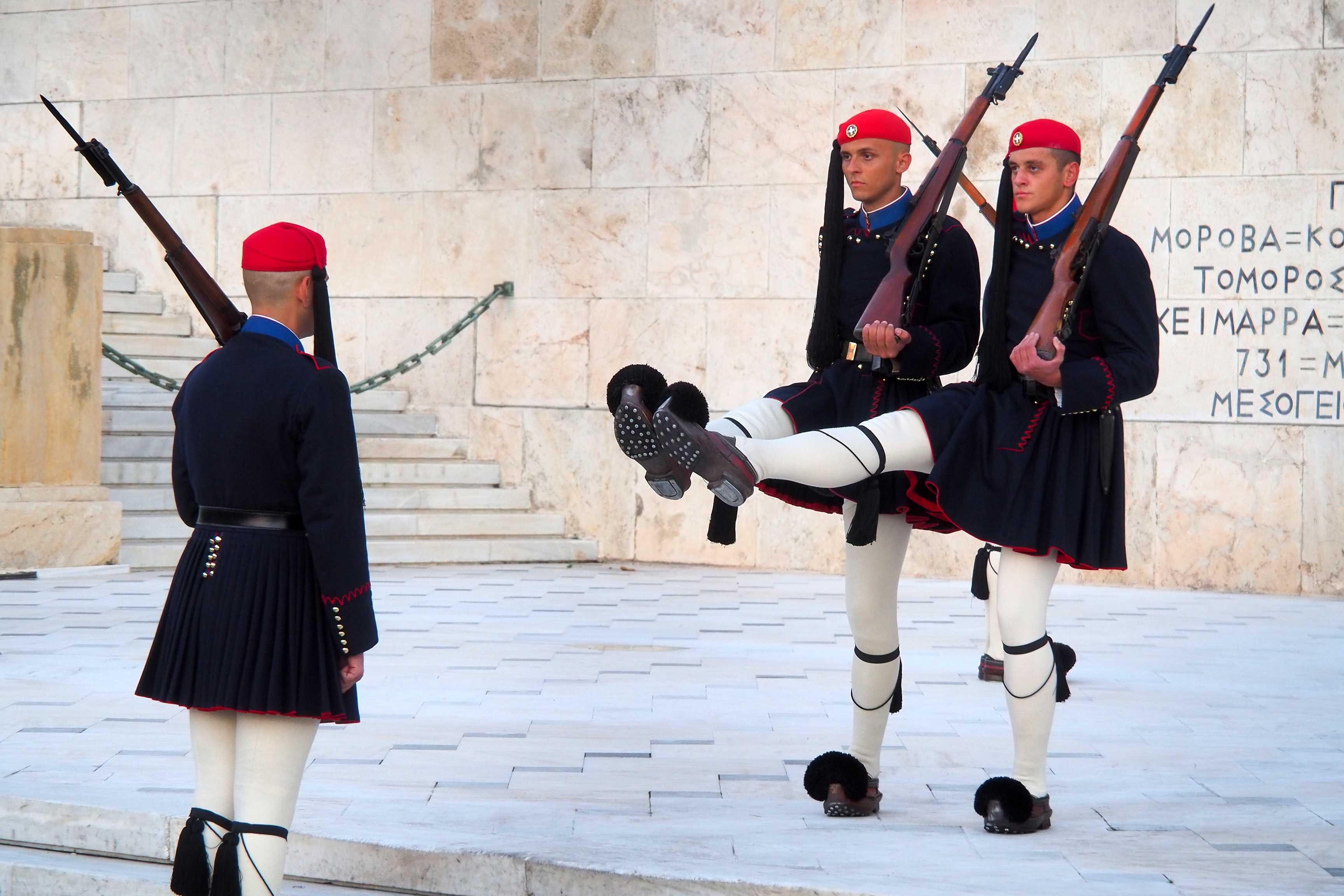 Du trottoir d'en face, nous allons donc assister à la relève de la garde. Une des plus étonnantes et curieuses qu'on puisse voir... Le rituel demande 5 semaines d'apprentissage et un grand équilibre dans le levé de jambe... Derrière chaque mouvement se cache une signification symbolique pour l'histoire de la Grèce. "Le levé de jambe simule le combat au corps à corps. Le pied salue les morts puis retombe avec force, expulsant les 400 ans d'esclavage sous l'occupation ottomane. L'union des deux jambes symbolise l'union des Grecs."