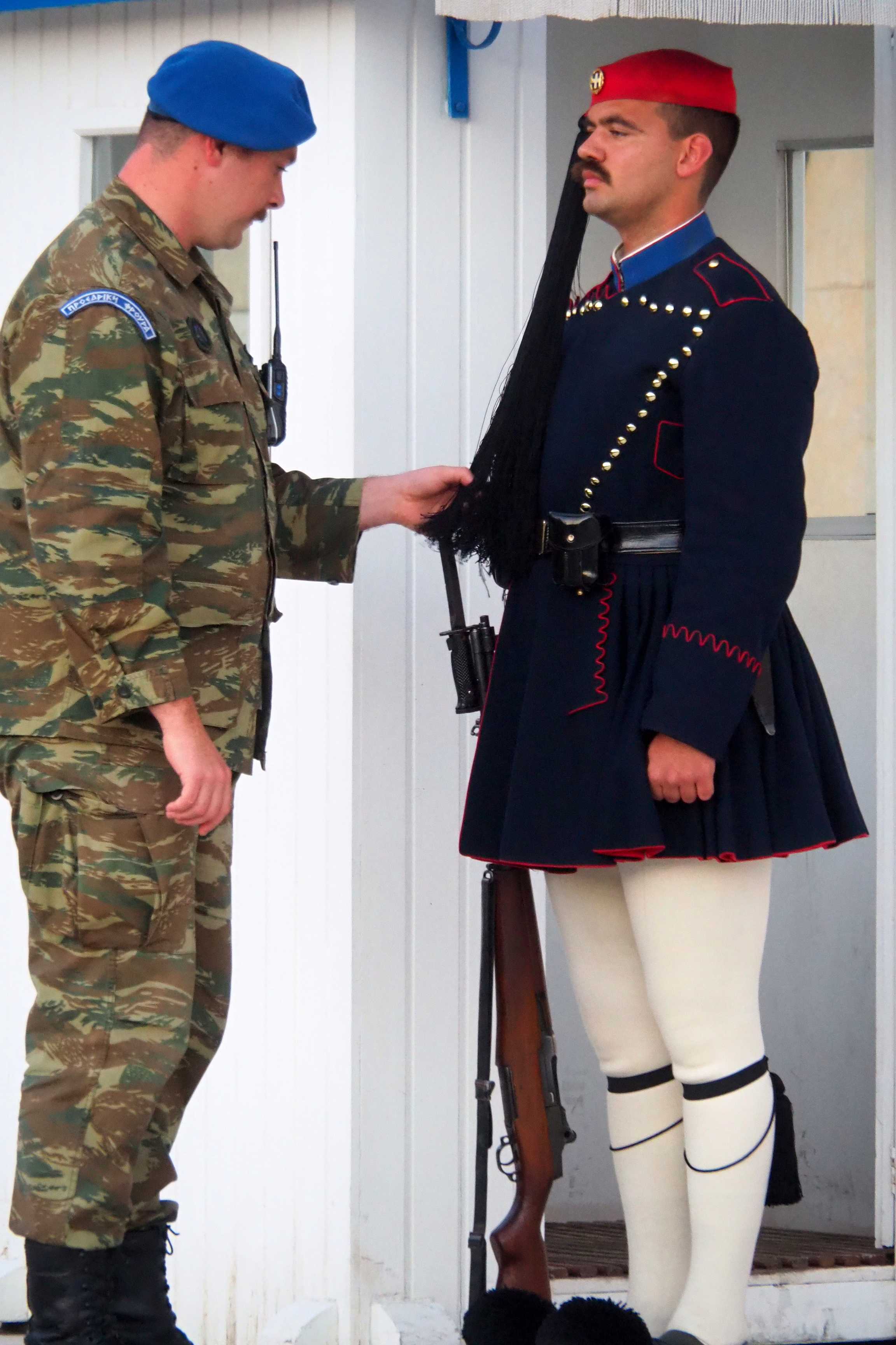 L'evzone imperturbable se laisse ainsi inspecter sous toutes les coutures par l'officier en treillis.
