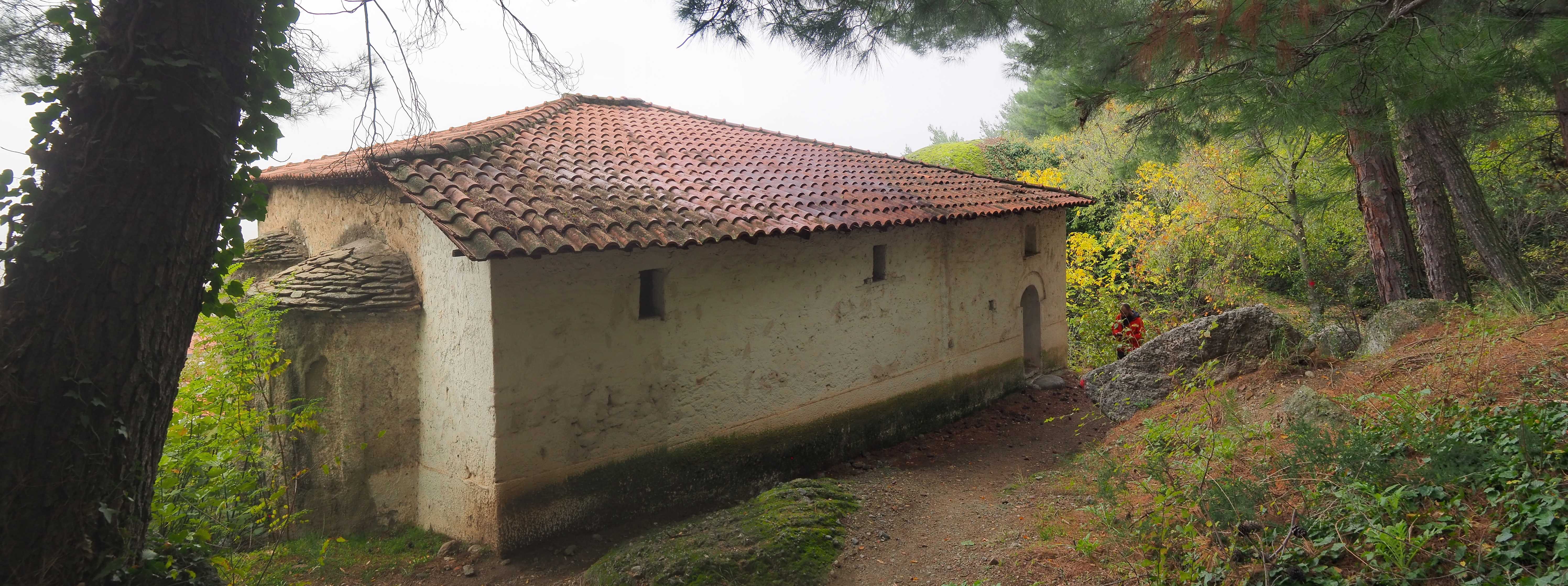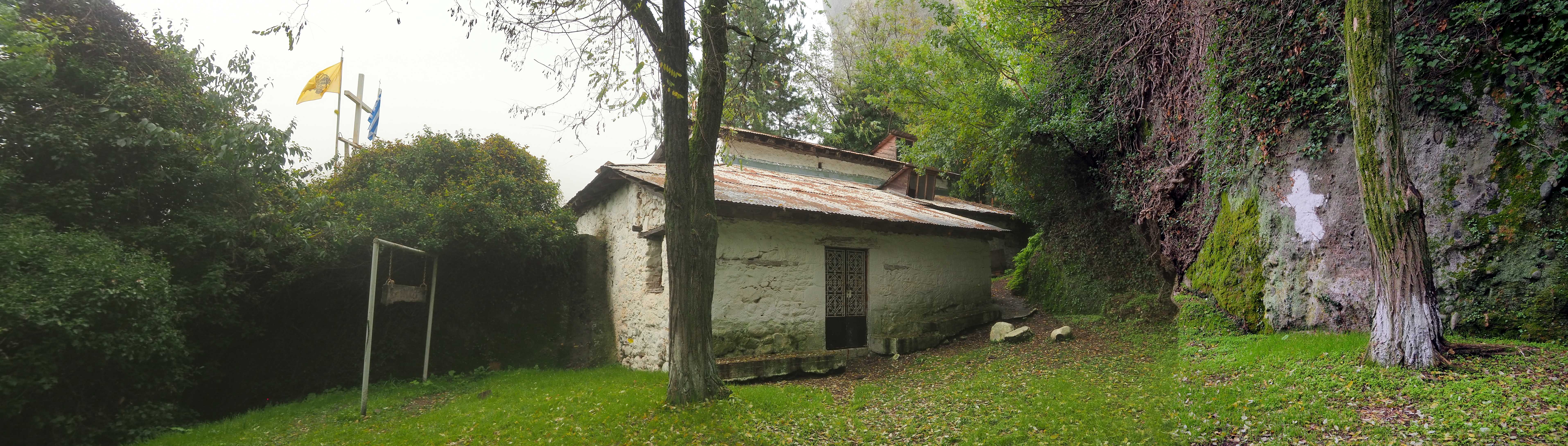 Cette grotte abrite une église (Agios Georgios Mandilas) dont on aperçoit les murs en ruine et ce qui semble être du linge suspendu sur des fils... Curieux assemblage placé à 40 mètres du sol et apparemment inaccessible. Pratiquement inaccessible oui, mais pas totalement. Une fois pas an, le 23 avril, le jour de la Saint-Georges, les villageois se rassemblent ici et accèdent à cette grotte à l'aide de cordes pour venir remplacer les tissus. Cette tradition a commencé après qu'une femme musulmane ait invoqué Saint Georges pour sauver son mari, accidenté au pied de cette falaise par la chute d'un arbre. La seule offrande qu'elle pouvait donner était son voile. Le mari s'en sorti finalement indemne et sans séquelles et il n'en fallut pas moins pour proclamer le miracle.