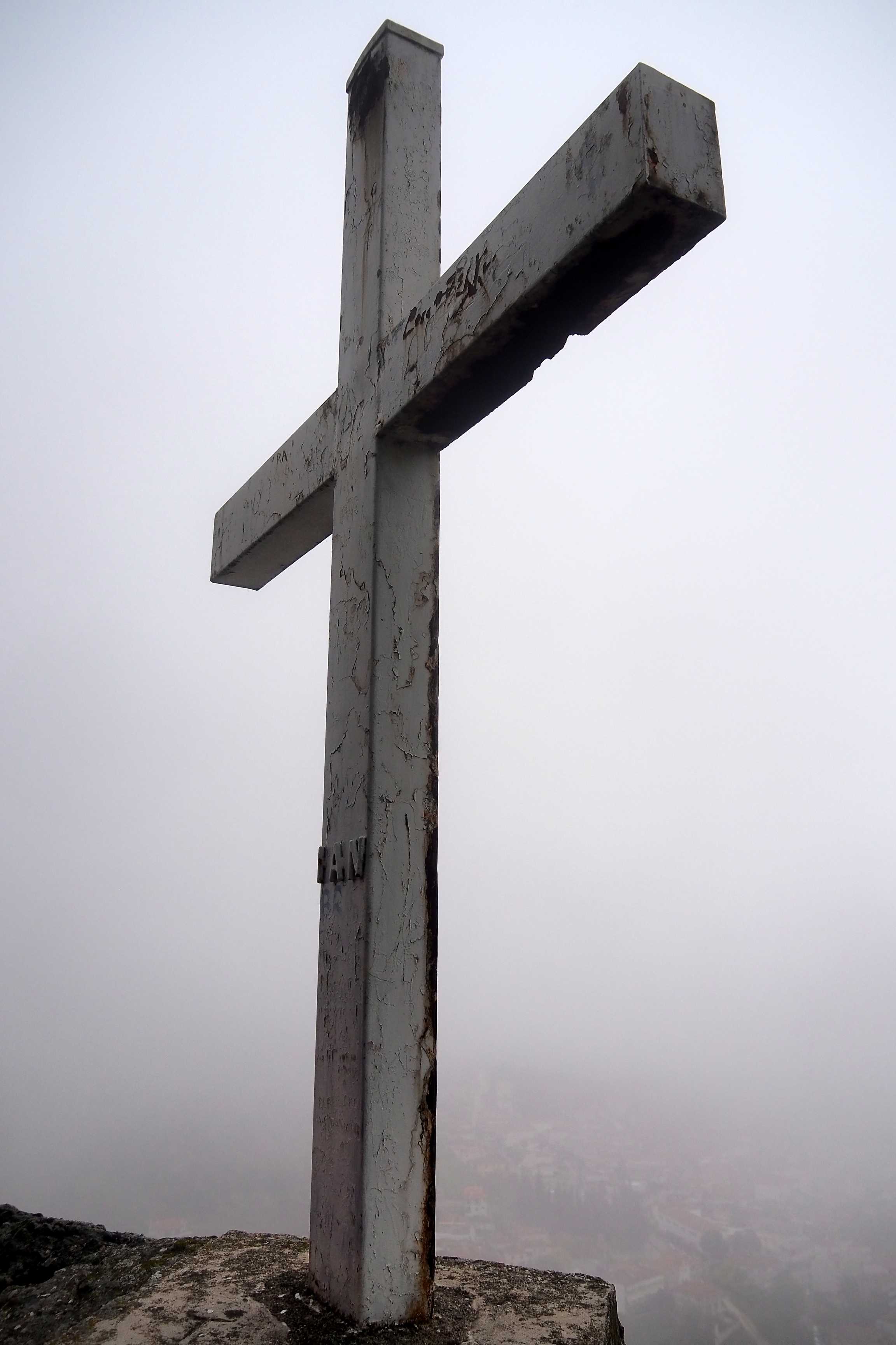 La croix est située sur les rochers formant le début de la falaise. Il faut des chaussures qui accrochent bien...