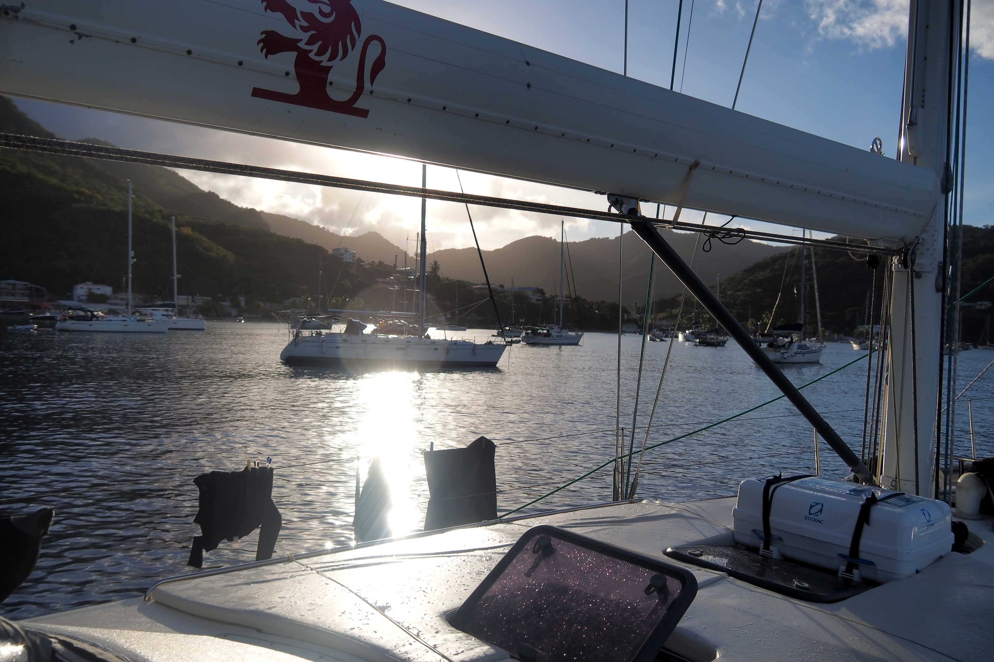 Et nous voilà dans notre coin d'amarrage où un arc-en-ciel nous souhaite la bienvenue. Nous jetons l'ancre dans le quartier de la Soufrière, l'occasion de croiser le WYLDE SWAN, navire de 45 mètres de long construit en 1920. Il est la plus grande goélette à deux-mâts du monde et est aujourd'hui un navire-école.