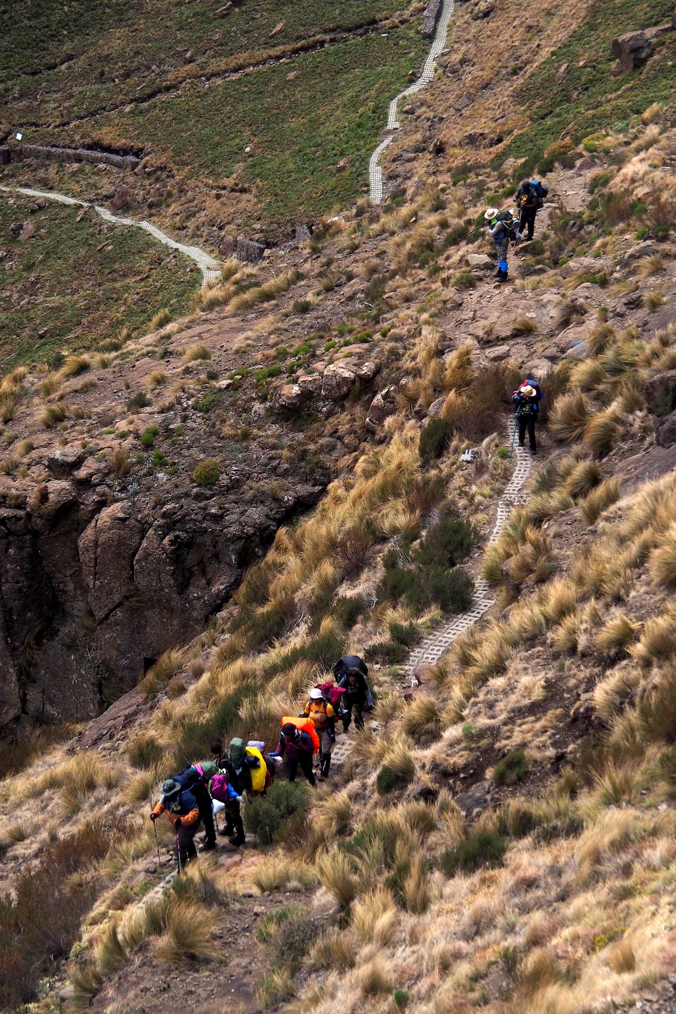 Un groupe arrive chargé. Il est possible de faire la randonnée en deux jours pour profiter du lever de Soleil du haut du plateau.