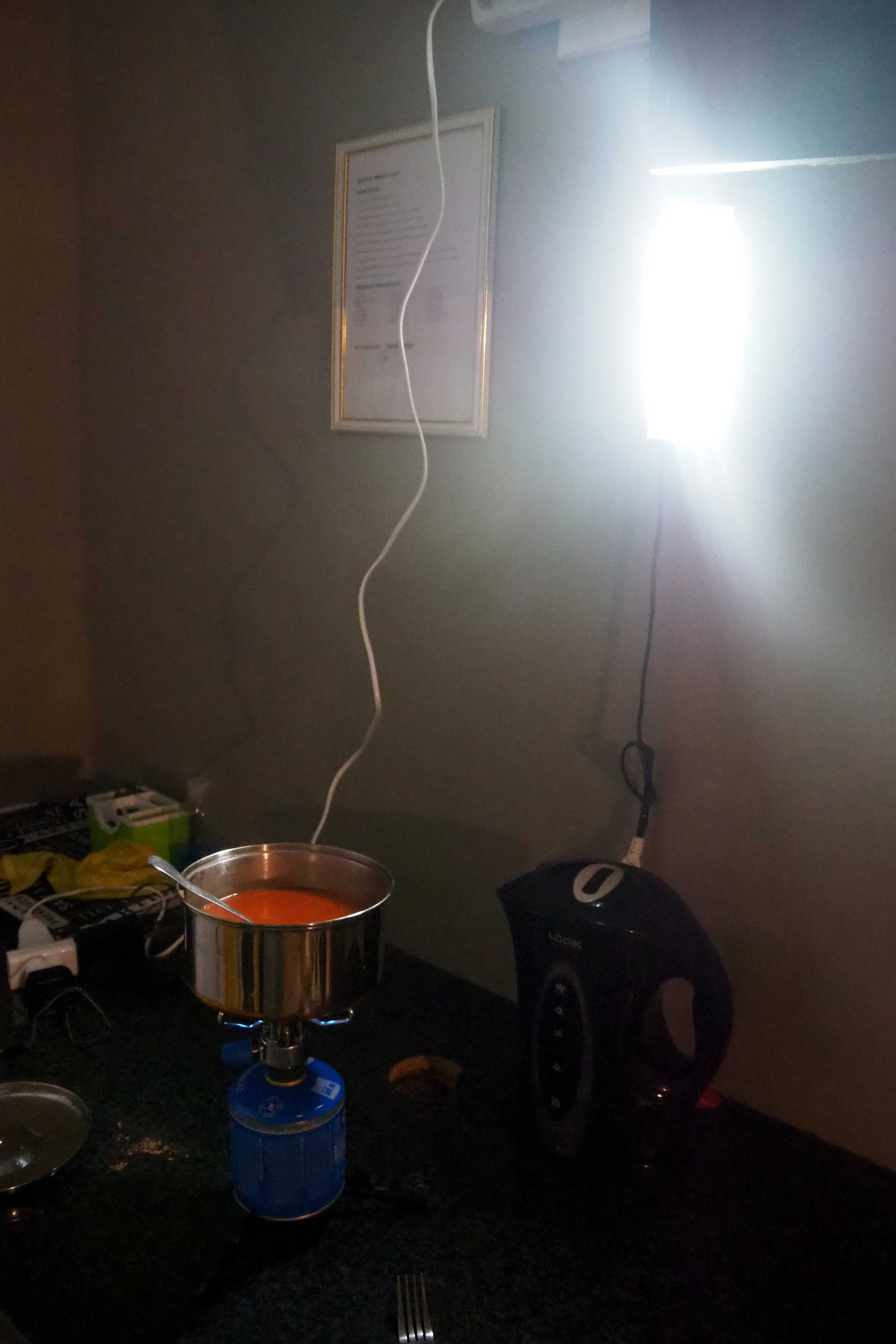 Dans notre chambre, c'est la panne de courant. Nous allumons les torches en même temps que notre réchaud à gaz...