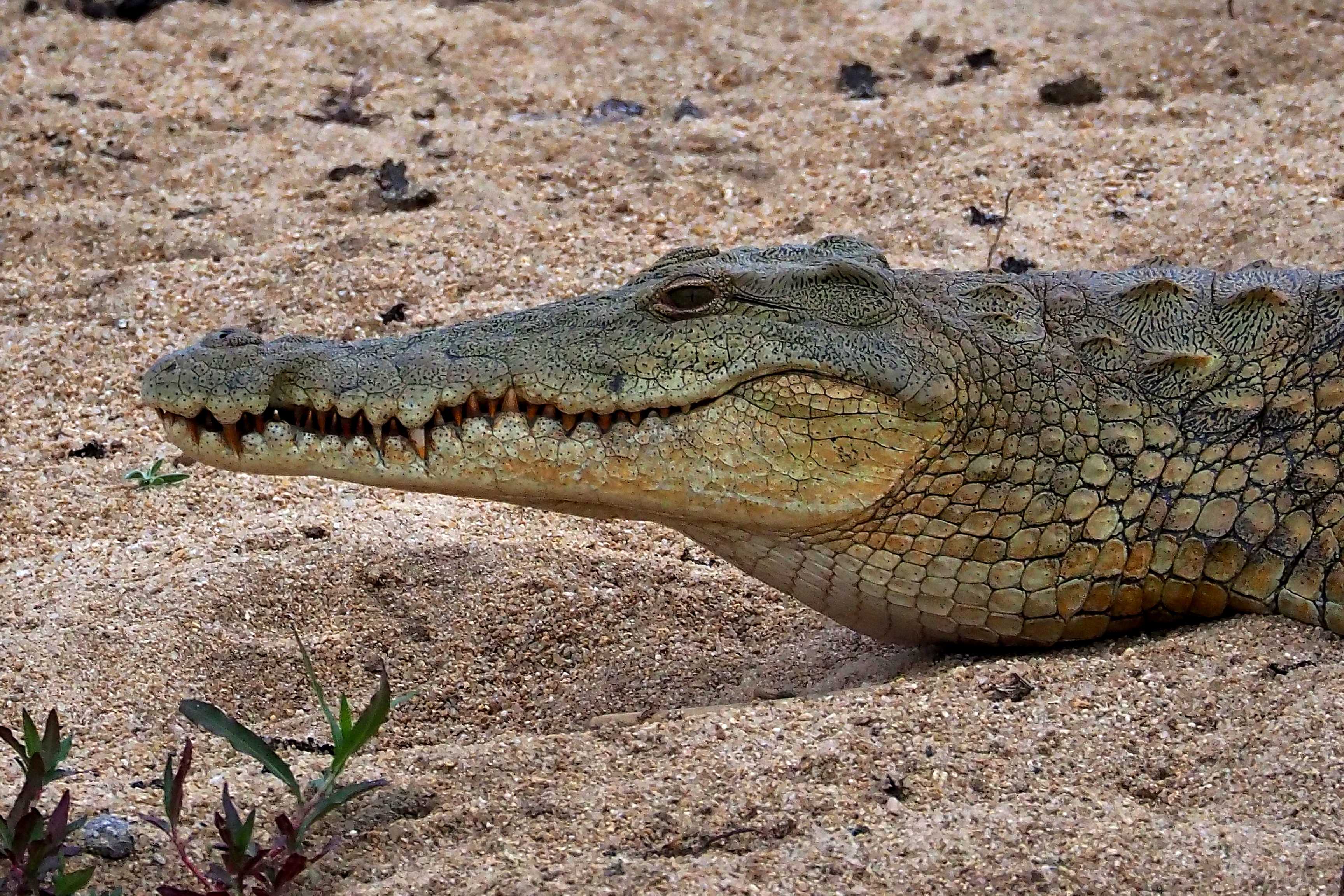 Une belle démonstration de camouflage... Il faut avoir l'oeil pour ne pas le rater. C'est le crocodile du Nil (Crocodylus niloticus).