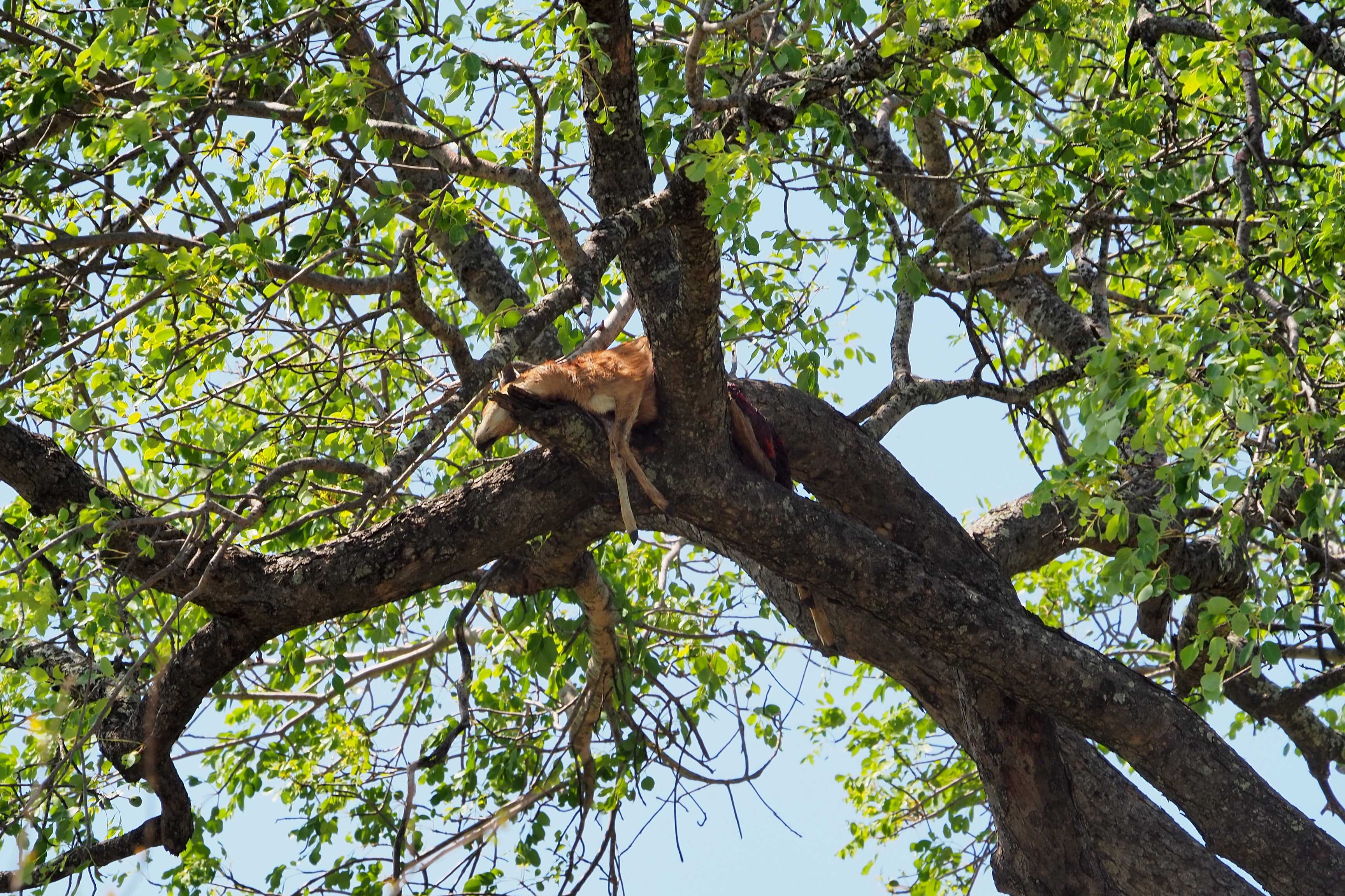 Un impala dans un arbre ??? Oui, c'est sans doute l'oeuvre d'un léopard qui pour mettre en sécurité son garde manger est capable de grimper tout là-haut avec sa lourde proie dans sa gueule...