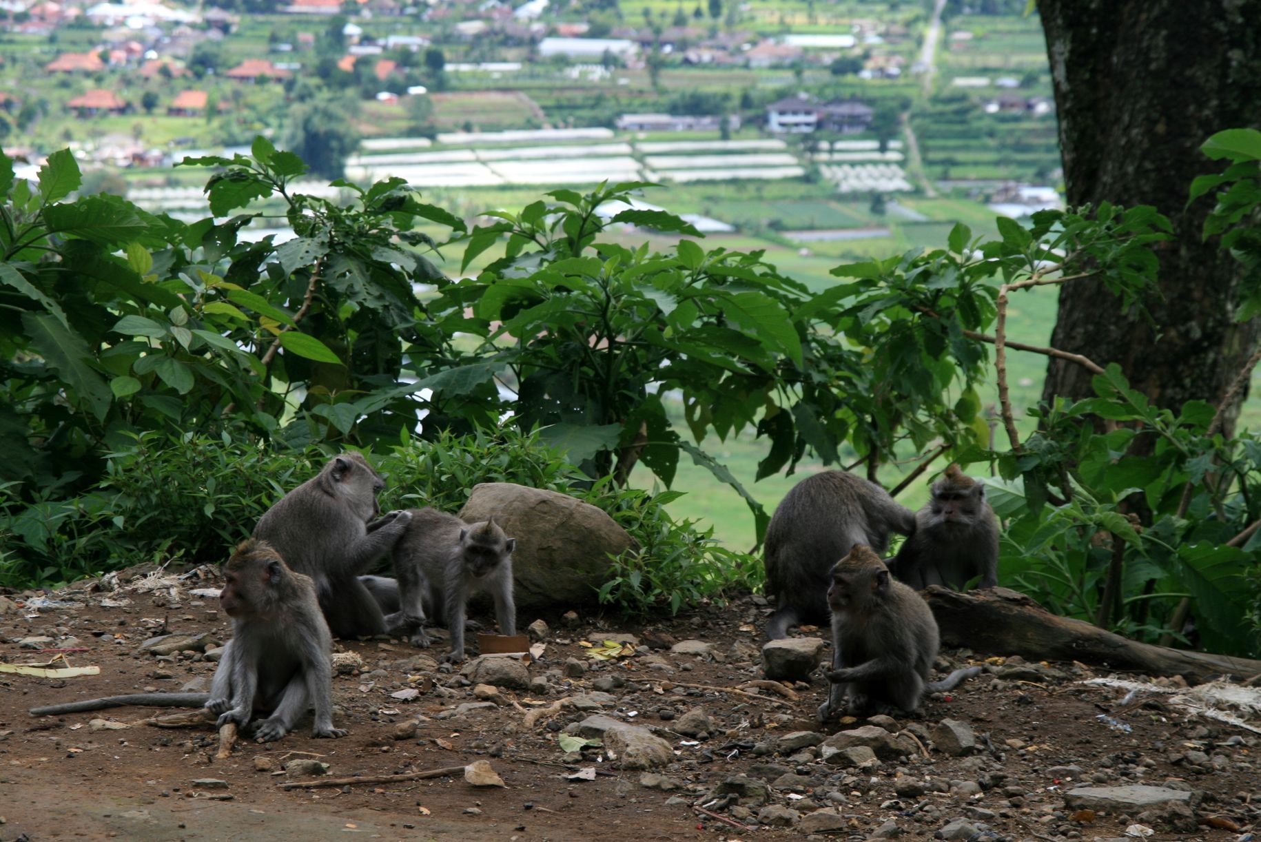 Cerca del lago Buyan, un grupo de monos macacos pasa el tiempo al borde de la carretera haciendo parar a los paseantes en busca de fotos de animales...
