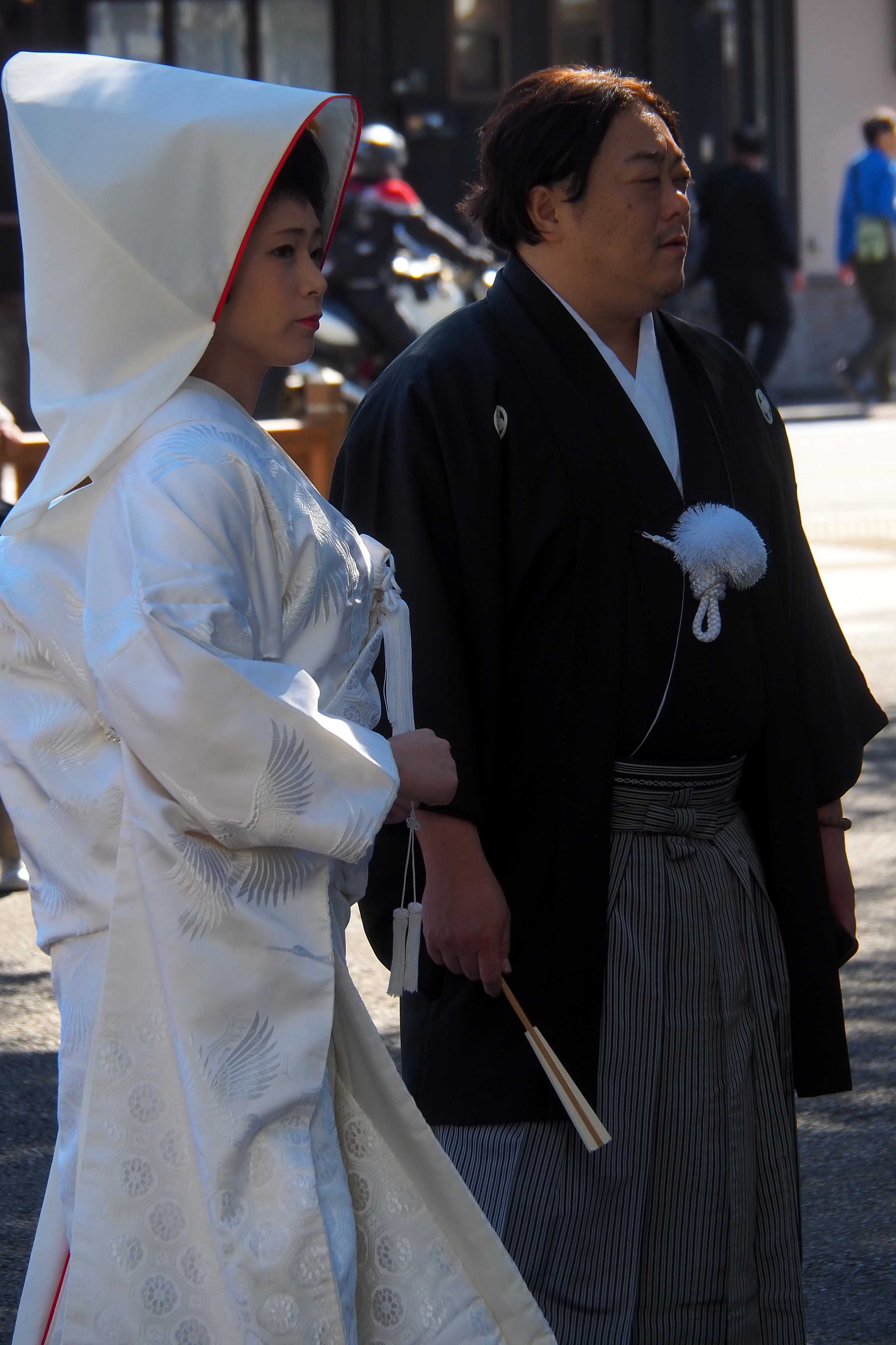 ¡Santuario sintoísta a menudo rima con matrimonio! De hecho, las bodas sintoístas tradicionales deben celebrarse en un lugar sagrado de dicha confesión. Los dos futuros esposos están aquí listos para entrar al santuario, con vestimenta tradicional. El blanco "shiromuku" para la señora, y el kimono "montsuki" para el señor.