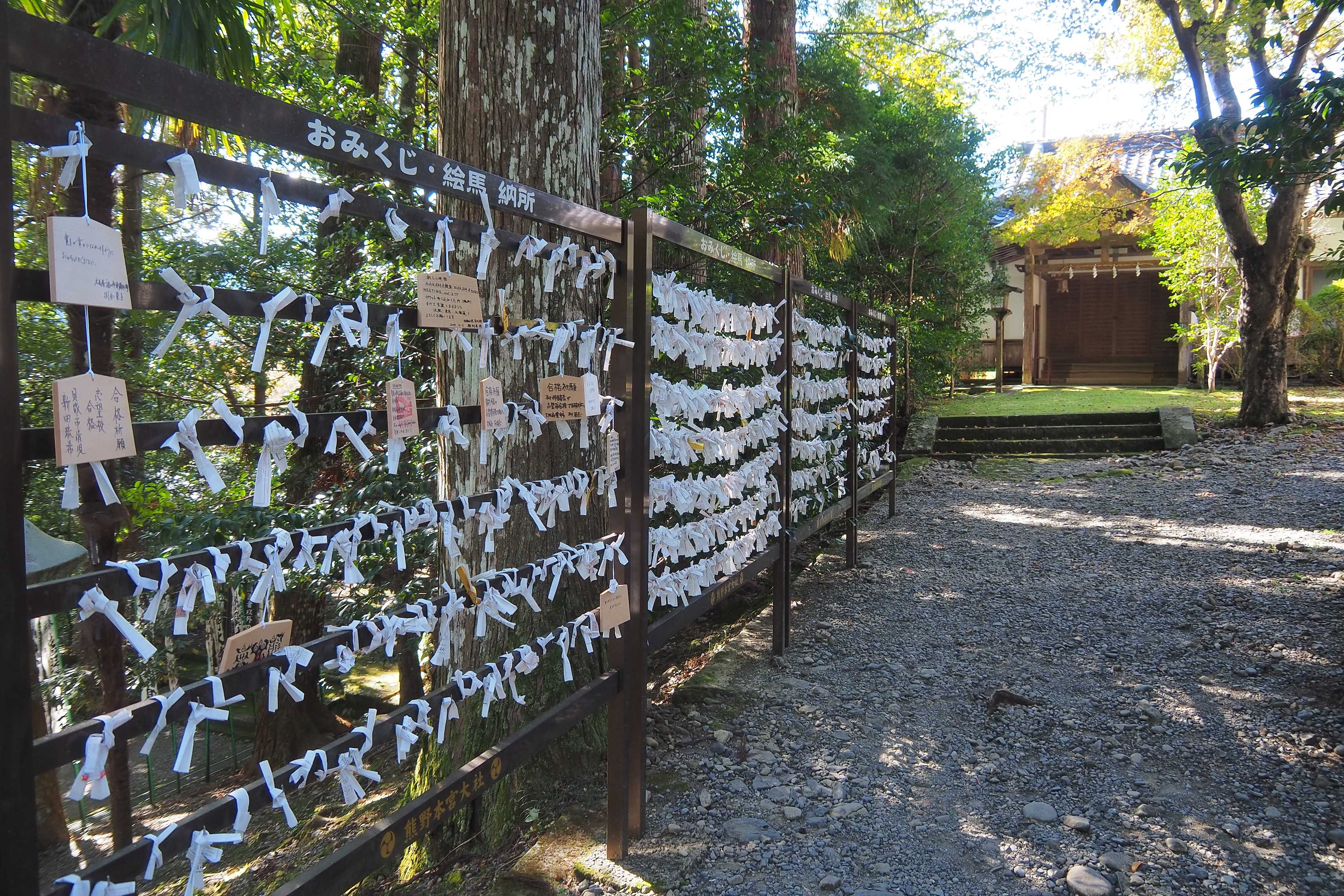 Junto a los omikuji, se cuelgan plaquetas ema con textos de agradecimiento o oraciones elegidas por los fieles.
