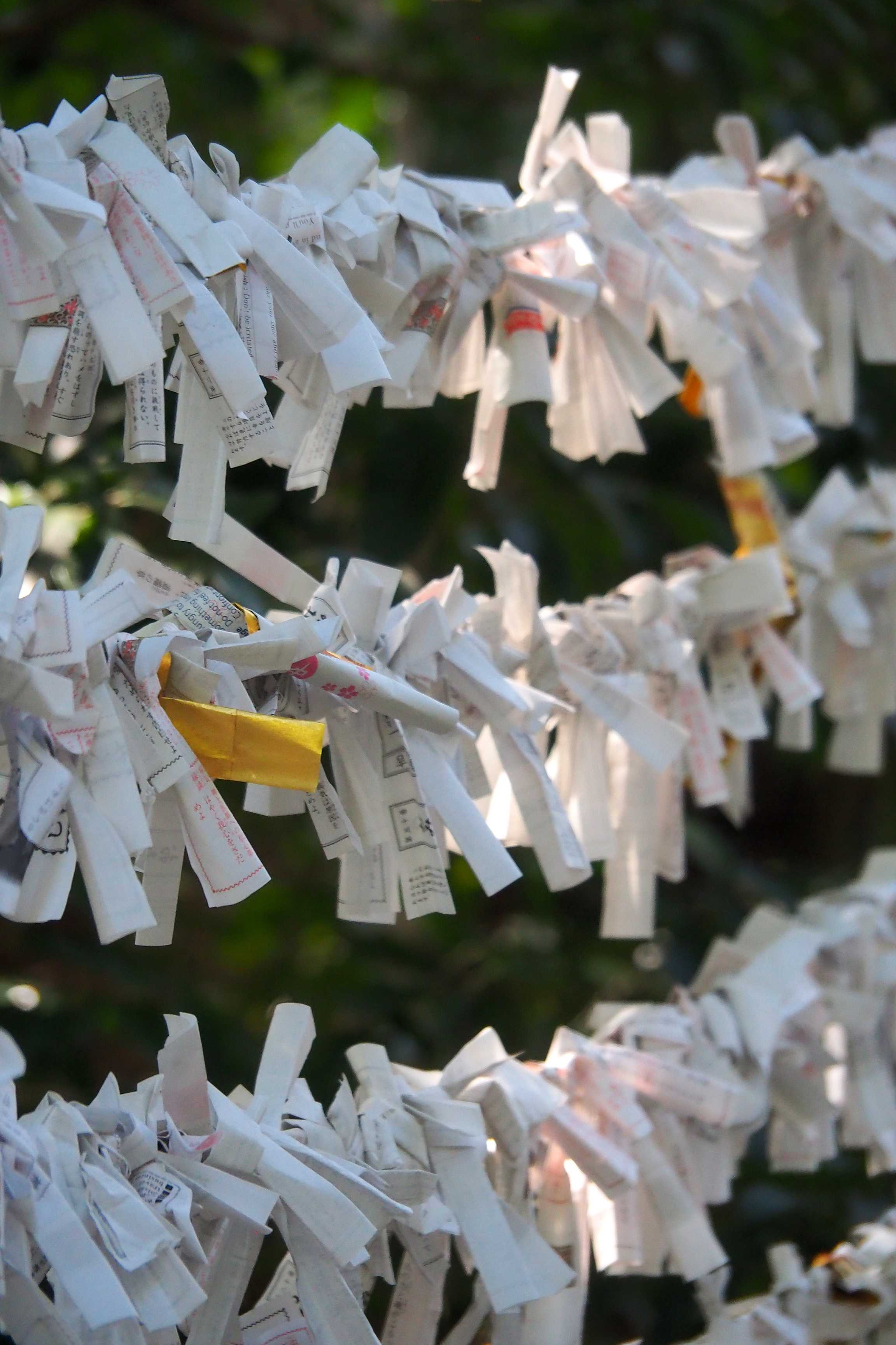 El otro elemento imprescindible de los templos sintoístas, las pequeñas tiras de papel donde se inscriben textos "adivinatorios". Estos omikuji son sorteados por los fieles con la esperanza de obtener un presagio positivo relacionado con su pregunta. Si la respuesta obtenida es un mal presagio, el papel se cuelga para conjurar la mala suerte...