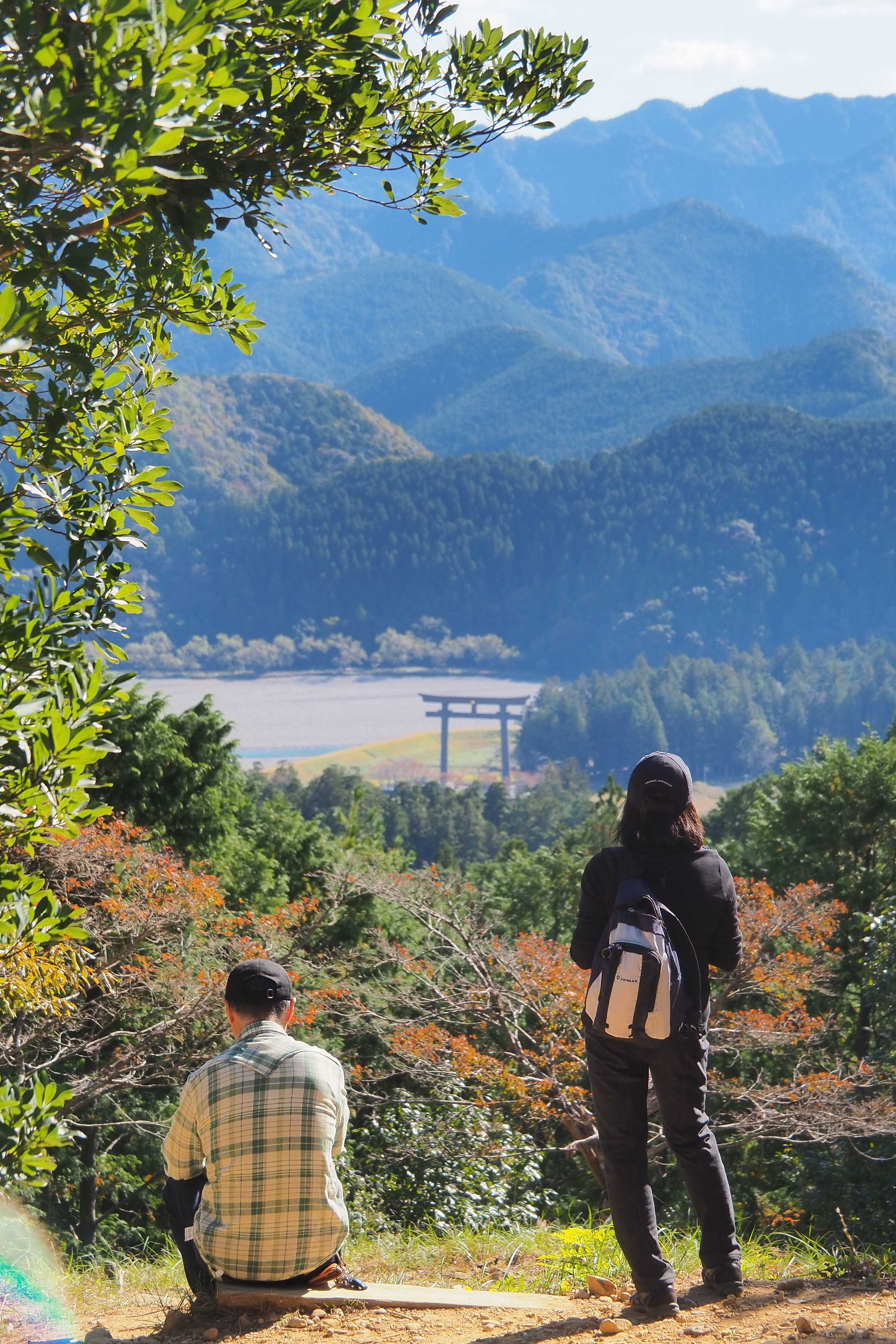 El camino pasa por un mirador sobre el valle y las magníficas montañas verdes. A lo lejos, se distingue una pequeña estructura, como posada en equilibrio, el gran Torii de Ōyunohara.